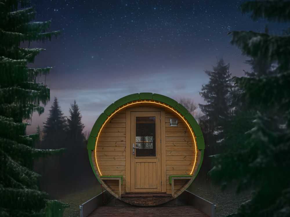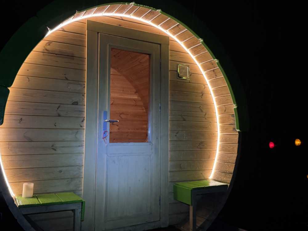 Stromversorgung: In der Sauna ist ein Akku verbaut der dafür sorgt, dass ihr immer Strom habt, egal an welchem Ort. Dadurch kann eine Ambiente - Beleuchtung nach eurem Wunsch geregelt werden oder auch das Handy geladen werden.